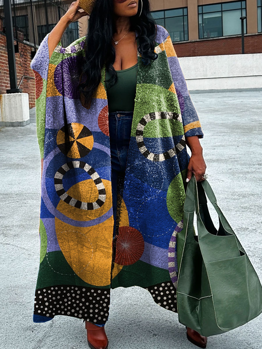 Women's Fashion Color Block Geometric Art Print Long Cardigan Sweater