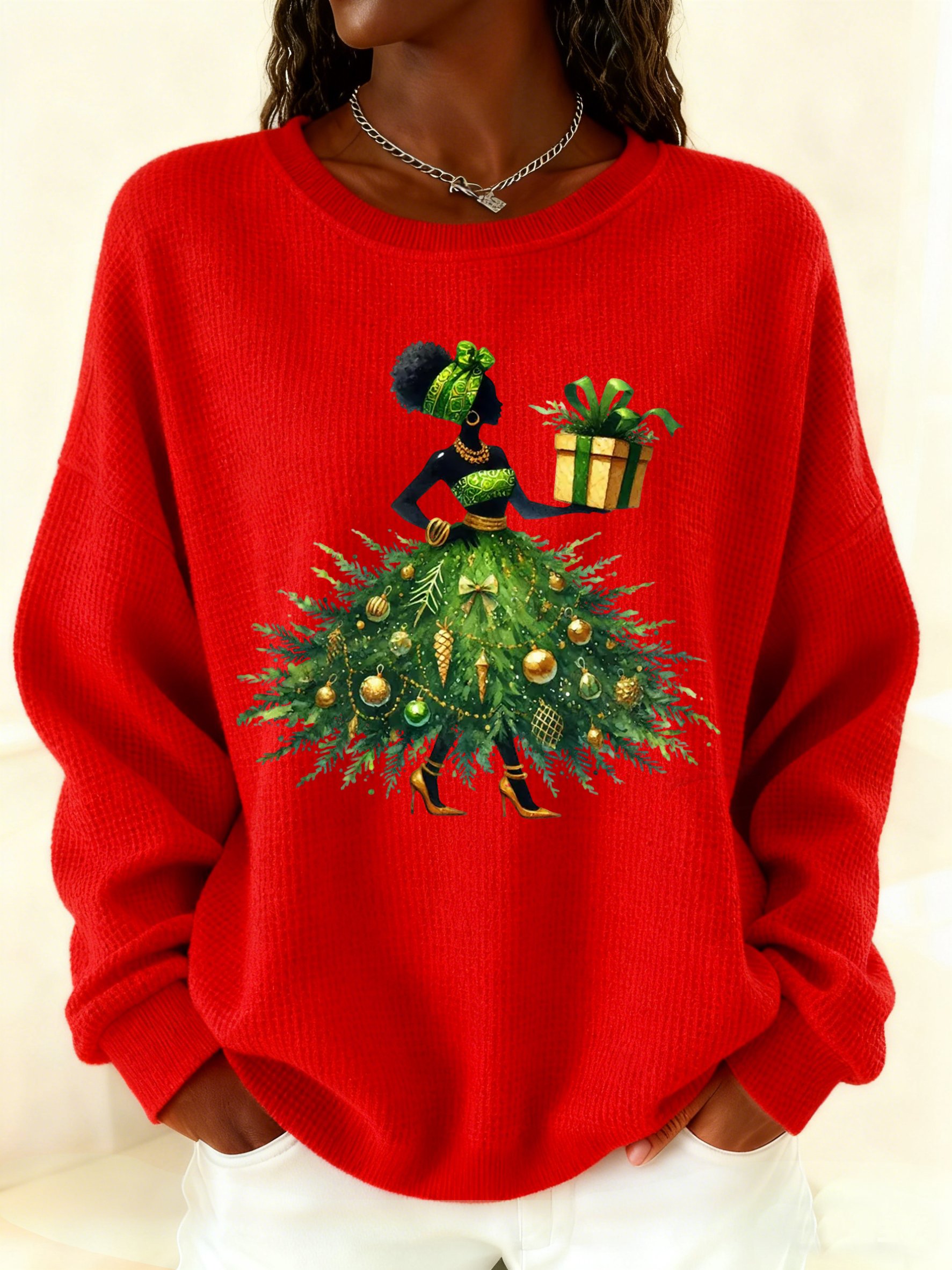 Women's Winter African American Women's Ethnic Christmas Girl Waffle Top