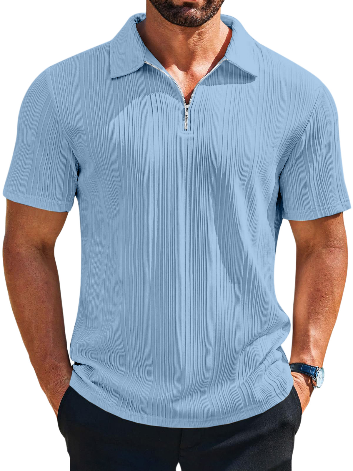Men's casual loose solid color texture zipper short-sleeved POLO shirt