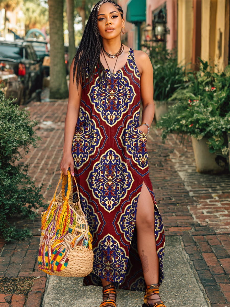 Women's Colorful Geometric Flowers Art Print Sleeveless Casual Suspender Dress