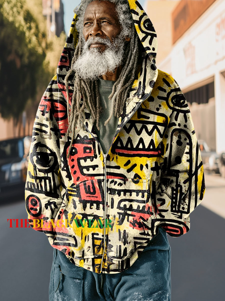 Men's Retro Abstract Art Print Leaf Zip-up Hoodie Sweatshirt