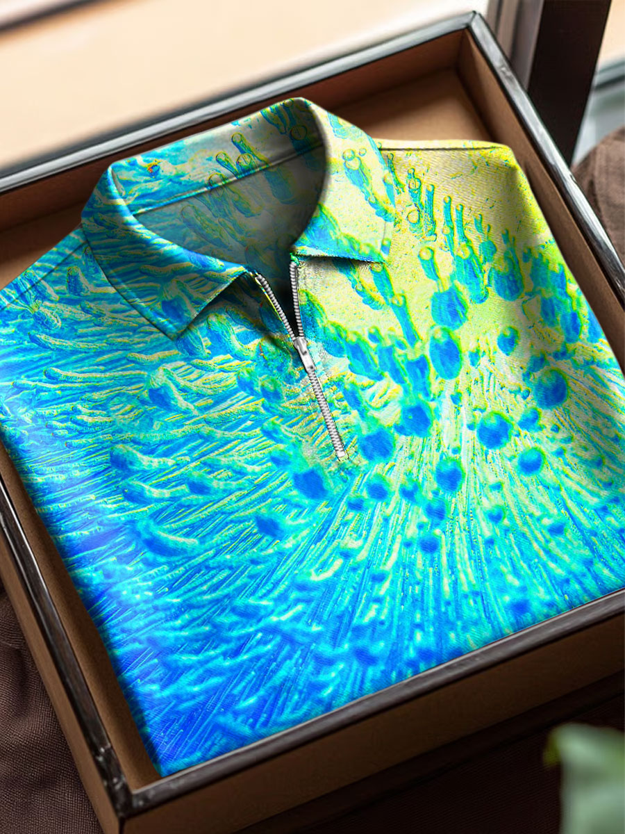 Men's Bright Waves Abstract Art Print Short Sleeved Lapel Zip Up Polo Shirt