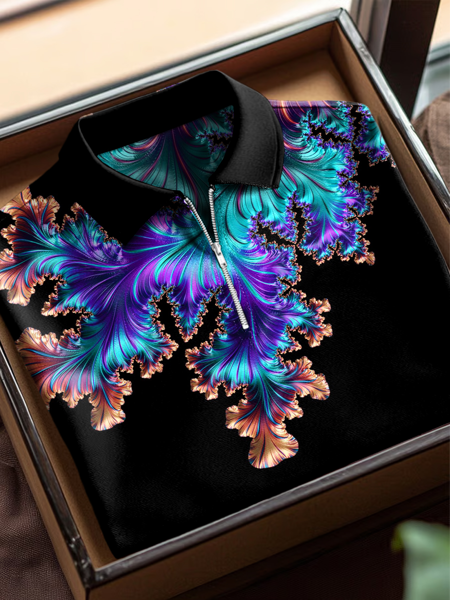 Men's Colorful Abstract Petals Art Print Short Sleeved Lapel Zip Up Polo Shirt