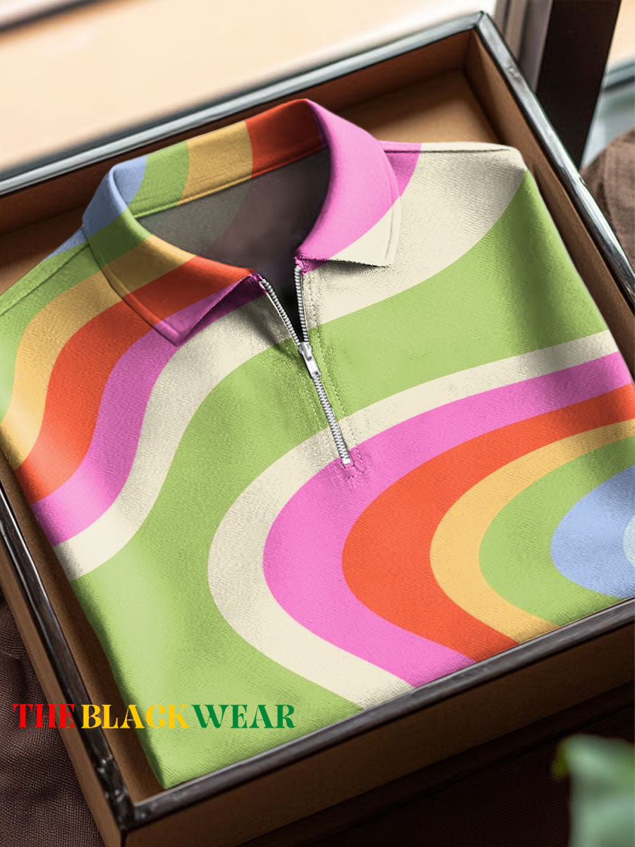 Men's Colorful Abstract Stripes Art Print Short Sleeved Lapel Zip Up Polo Shirt