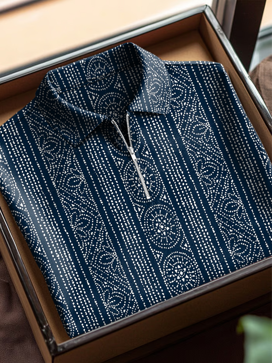 Men's Retro Bohemian Art Print Short Sleeved Lapel Zip Up Polo Shirt