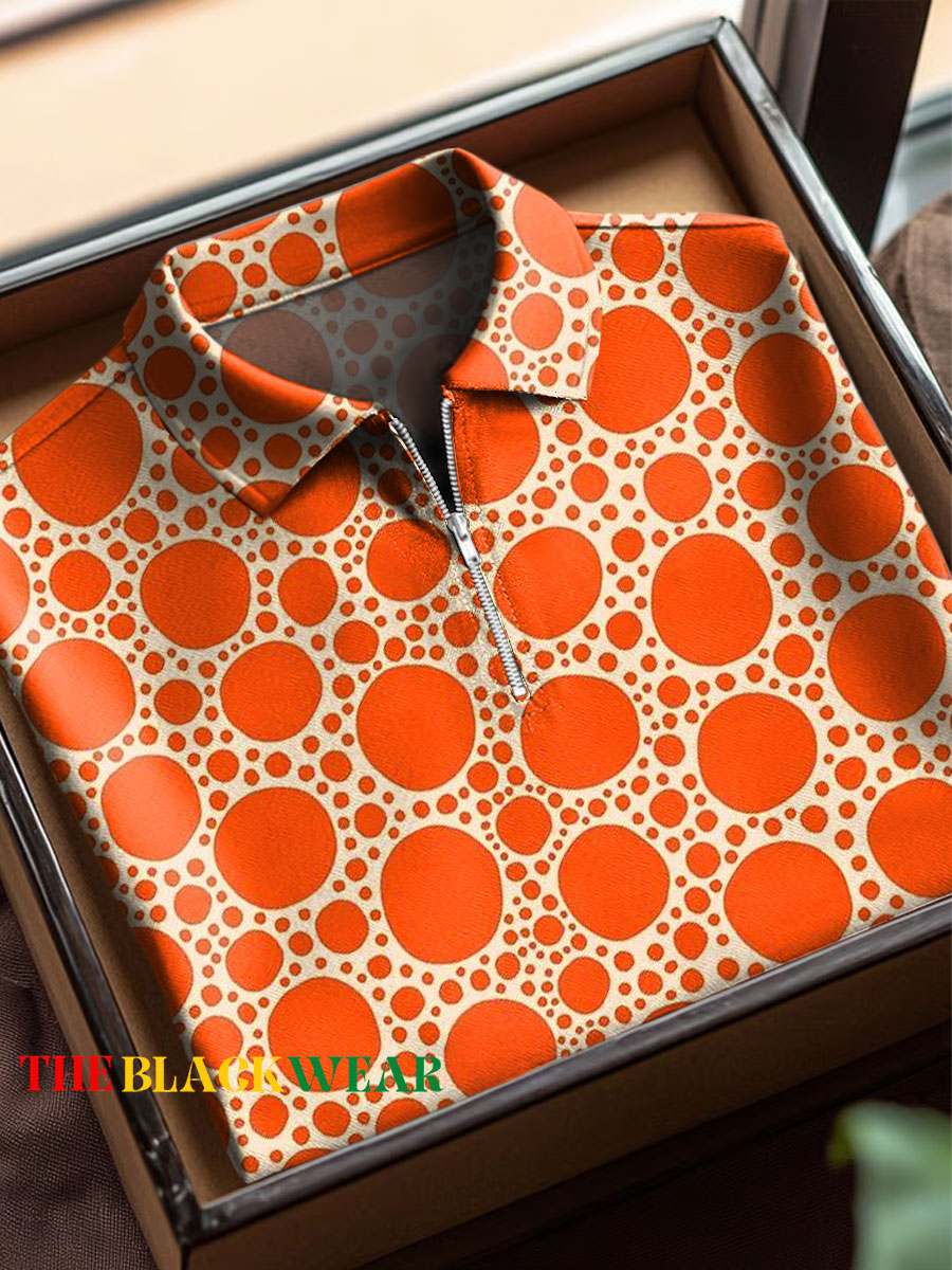 Men's Vintage Colorblock Geometric Art Print Short Sleeved Lapel Zip Up Polo Shirt