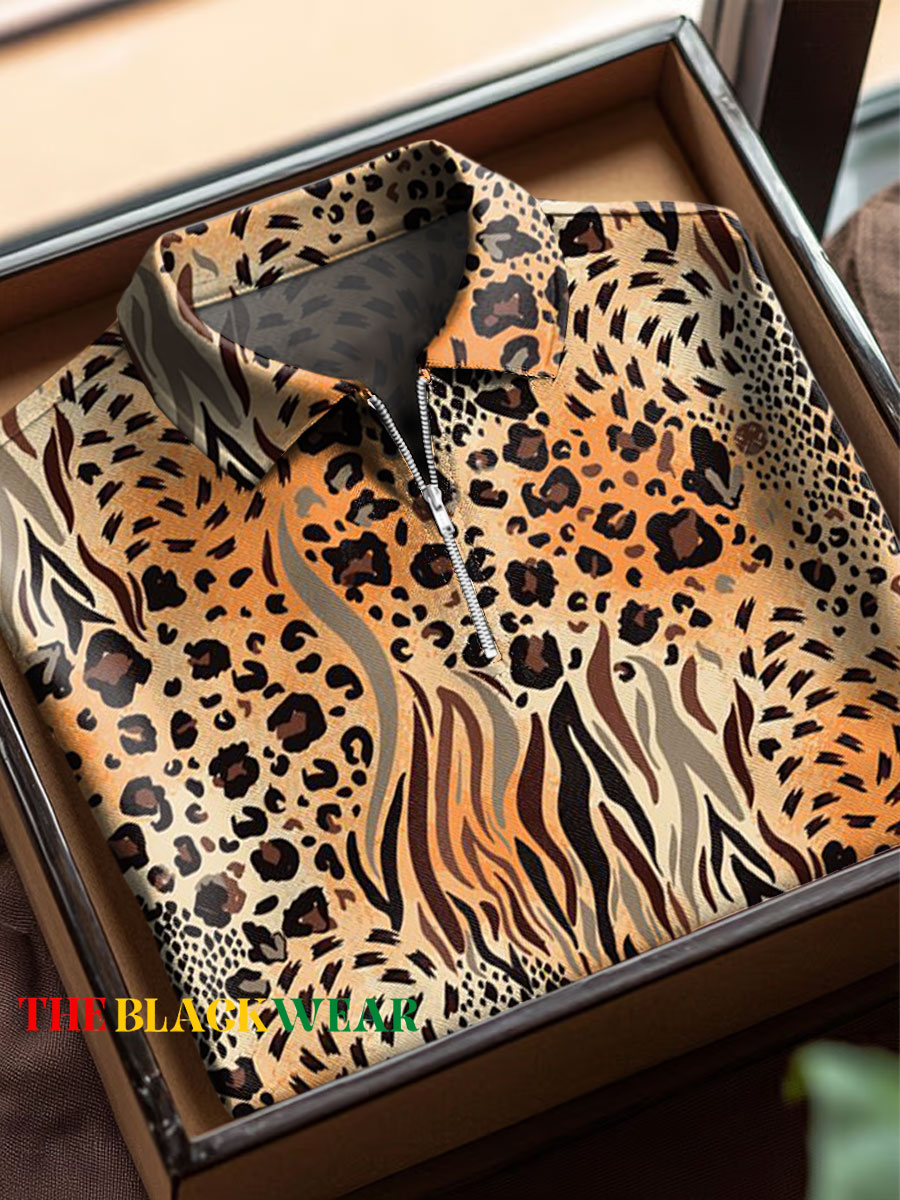 Men's Vintage Leopard Art Print Short Sleeved Lapel Zip Up Polo Shirt