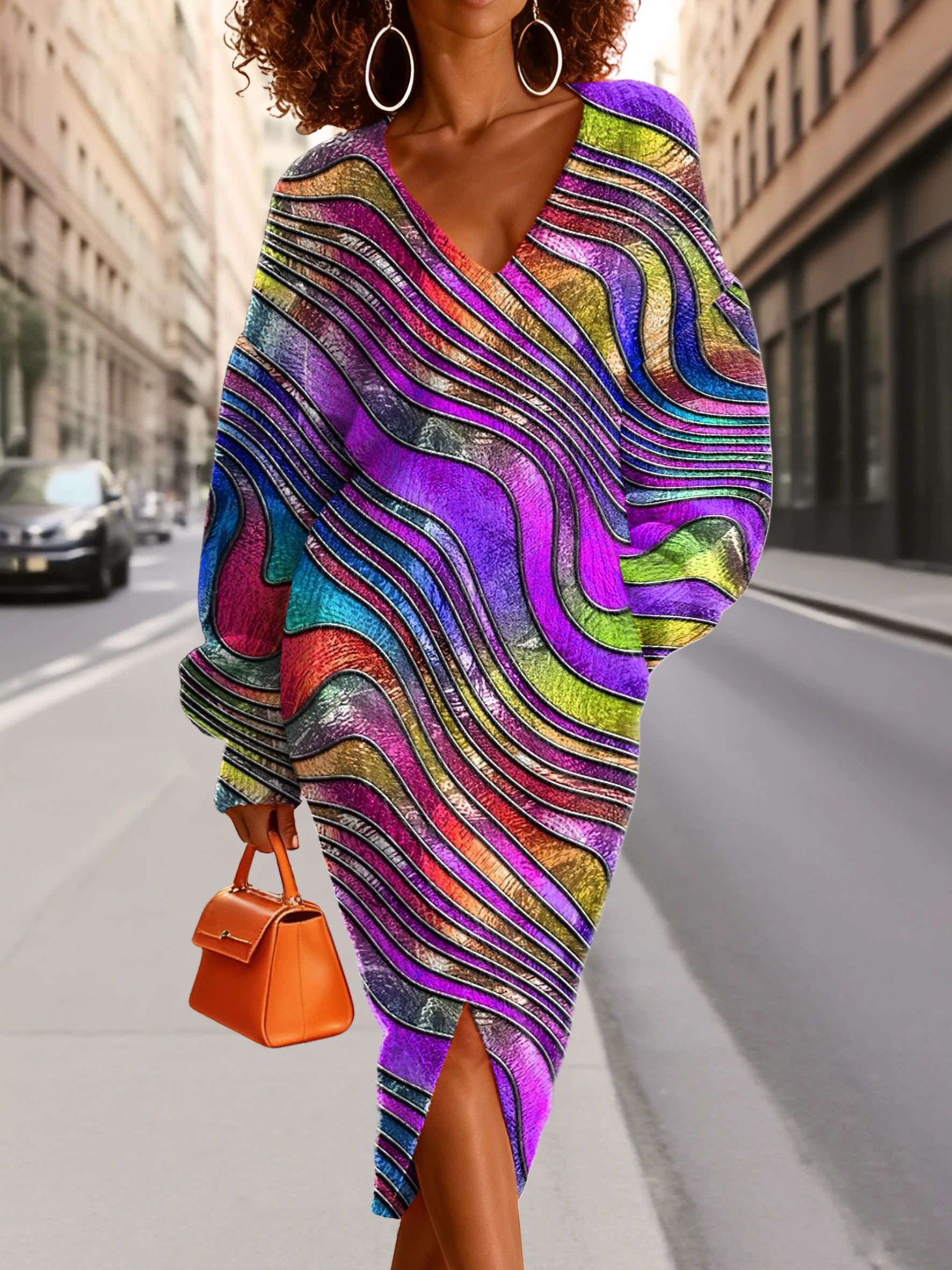 Fashion Stripe Art Print V Neck Sweater Midi Dress