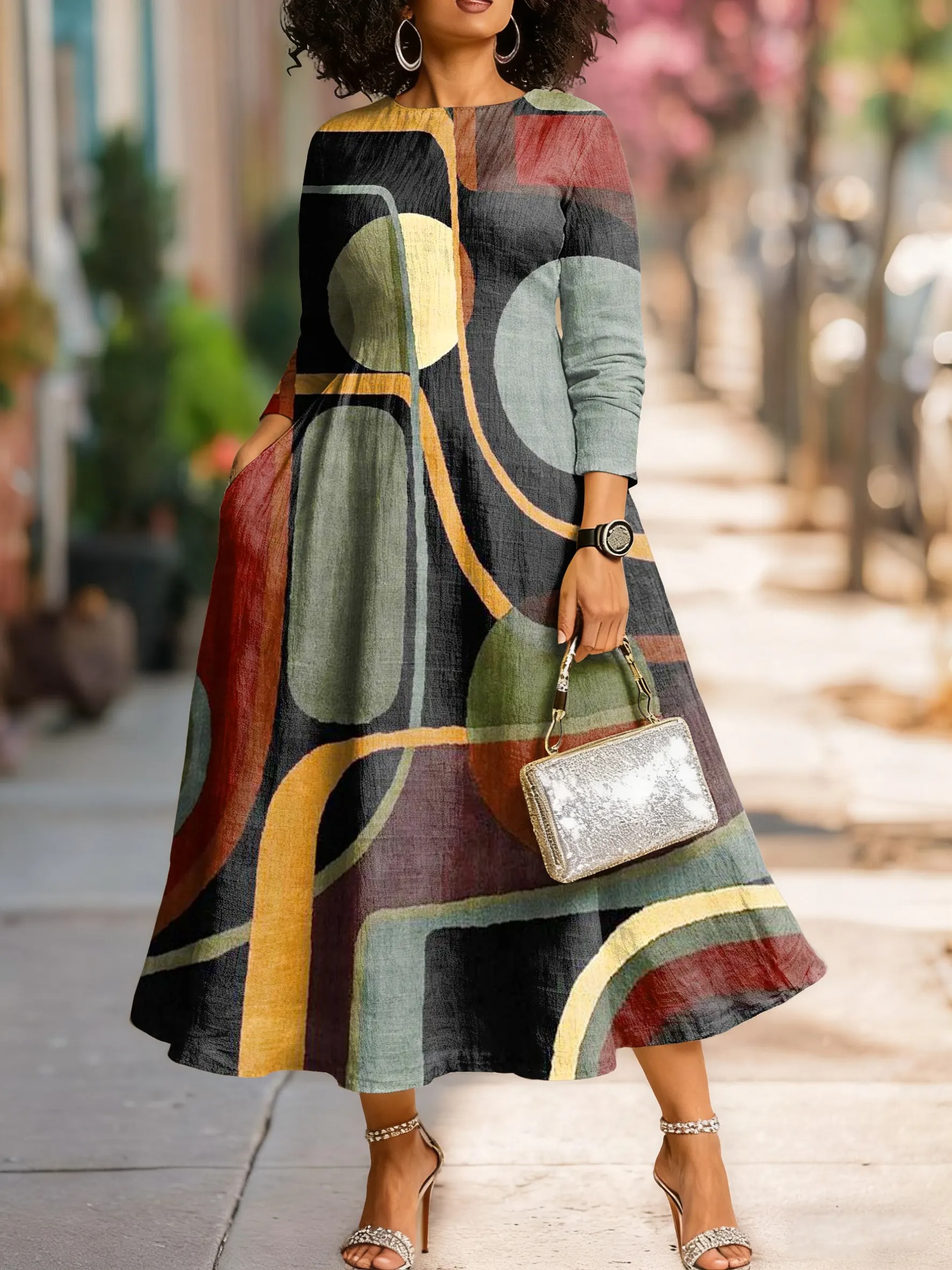 Retro Abstract Color Block Texture Art Print V Neck Sweater Midi Dress