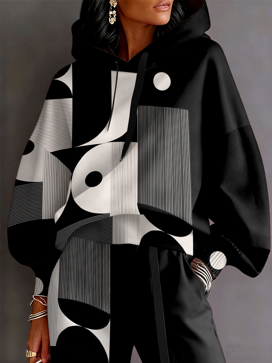Vintage Abstract Geometric Line Art Print Casual Hooded Sweatshirt