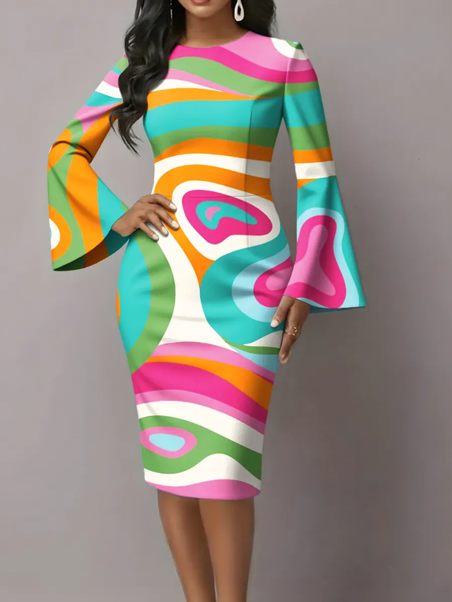 Women's Colorful Abstract Geometric Art Prints Flared Sleeves Midi Bodycon Dresses