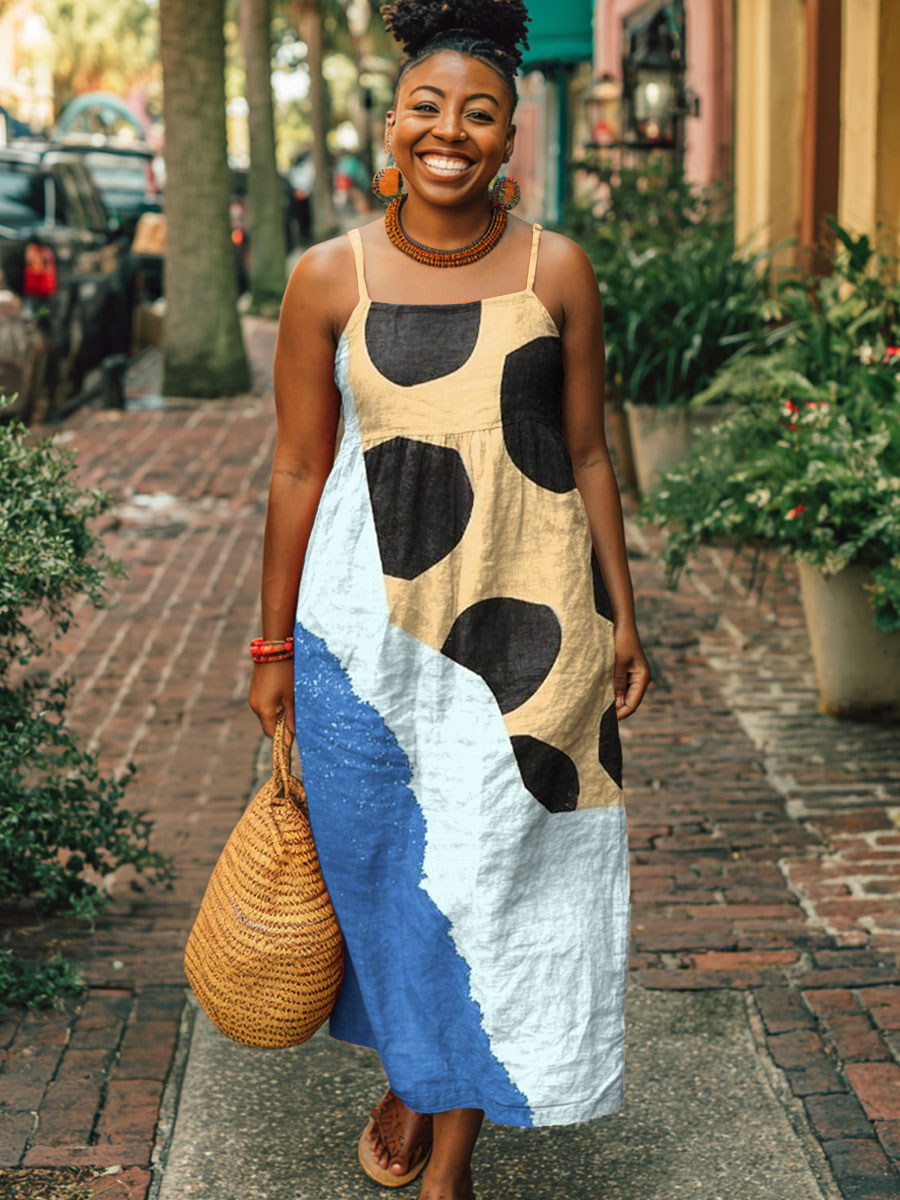 Women's Fashion Color Block Geometric Art Print Sleeveless Suspender Casual Cotton Pocket Dress