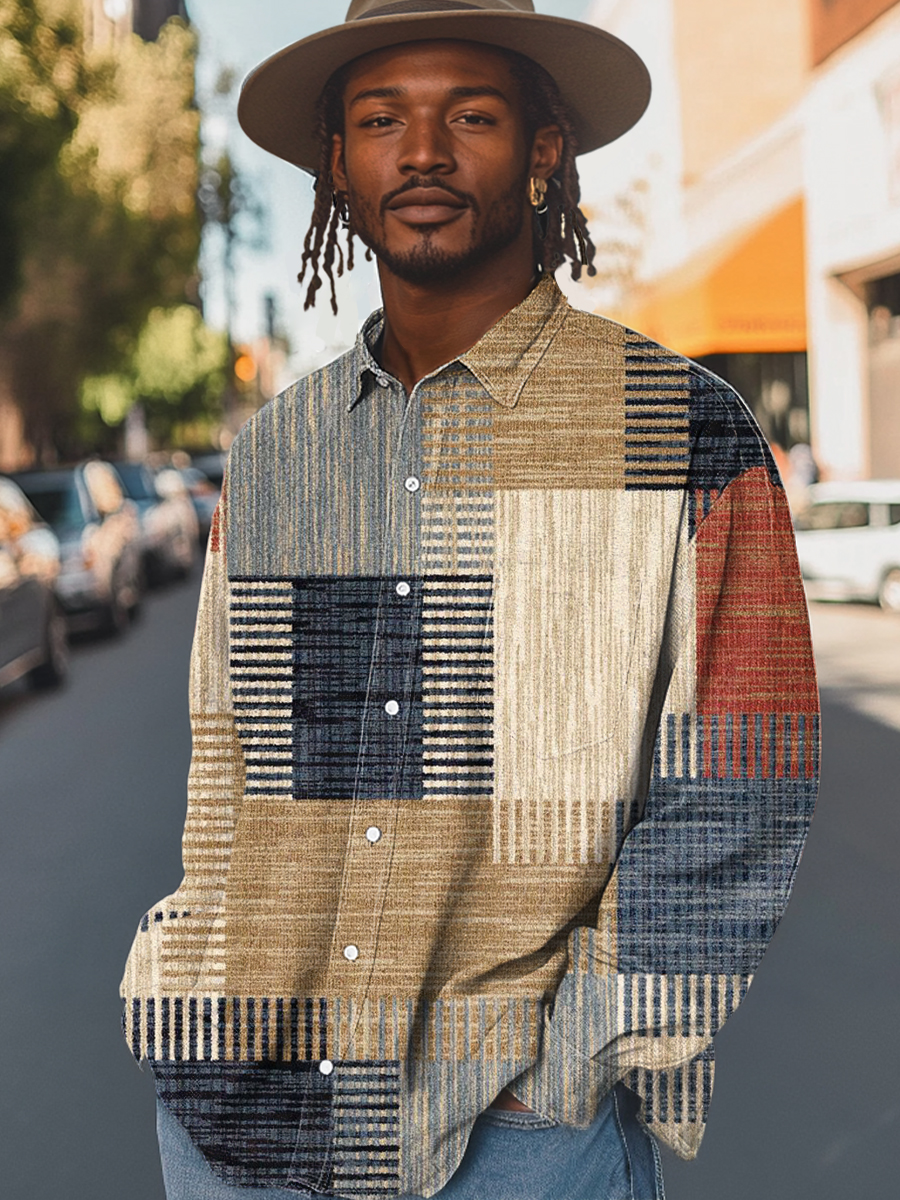 Minimalist Art Geometry Vintage Stripe Print 100% Cotton Long Sleeve Shirt