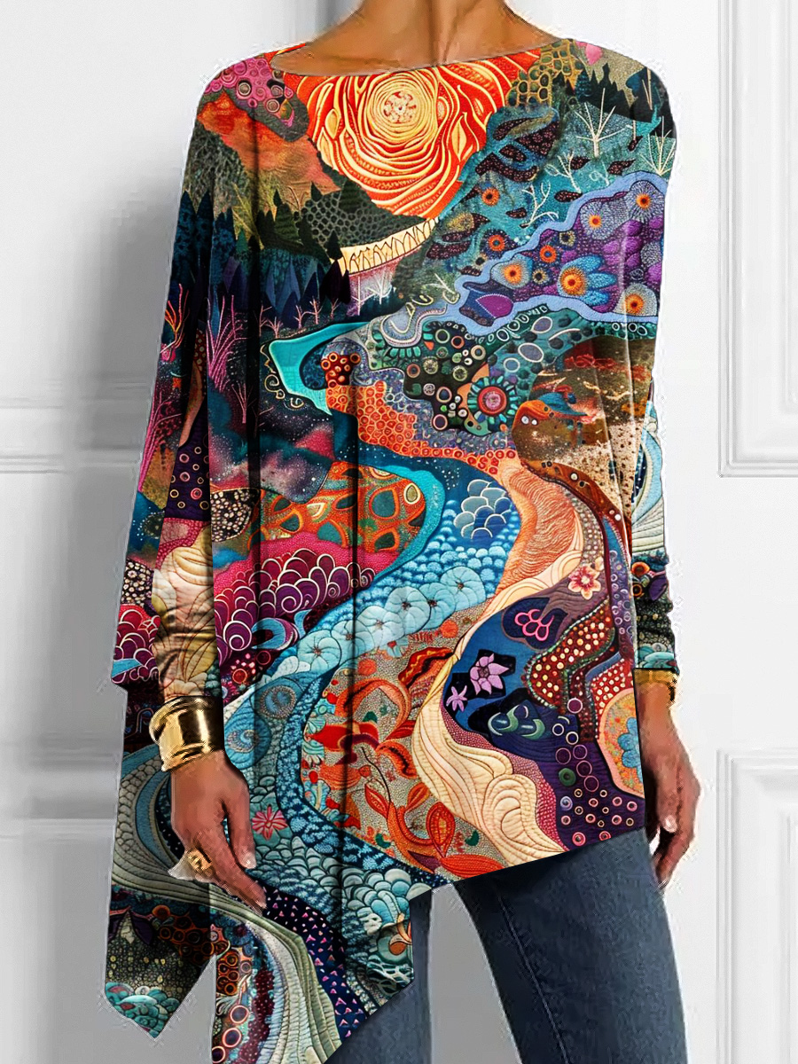 Women's Colorful Abstract Flowers Stripes Art Print Button Back Casual Knitted Shirt