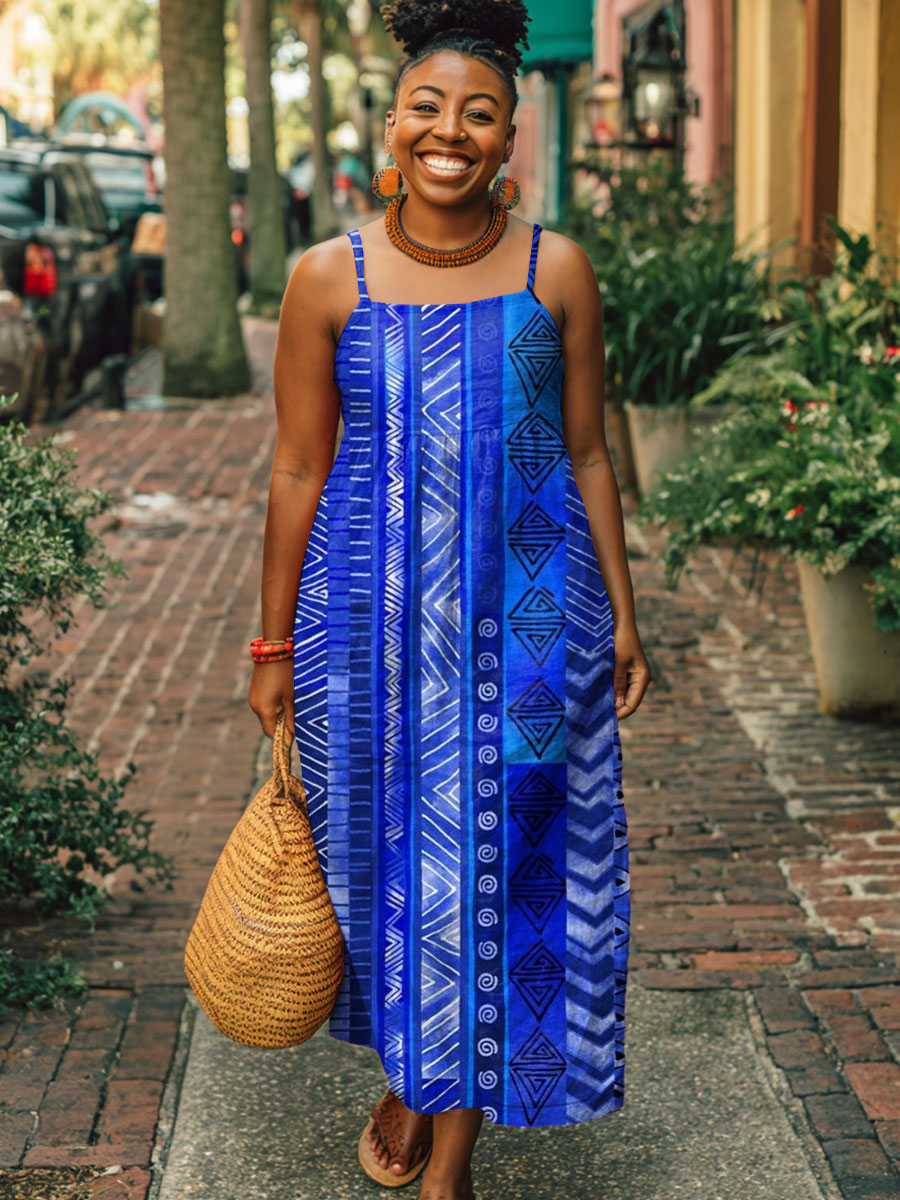 Women's Vintage Ethnic Pattern Art Print Sleeveless Suspender Casual Cotton Pocket Dress