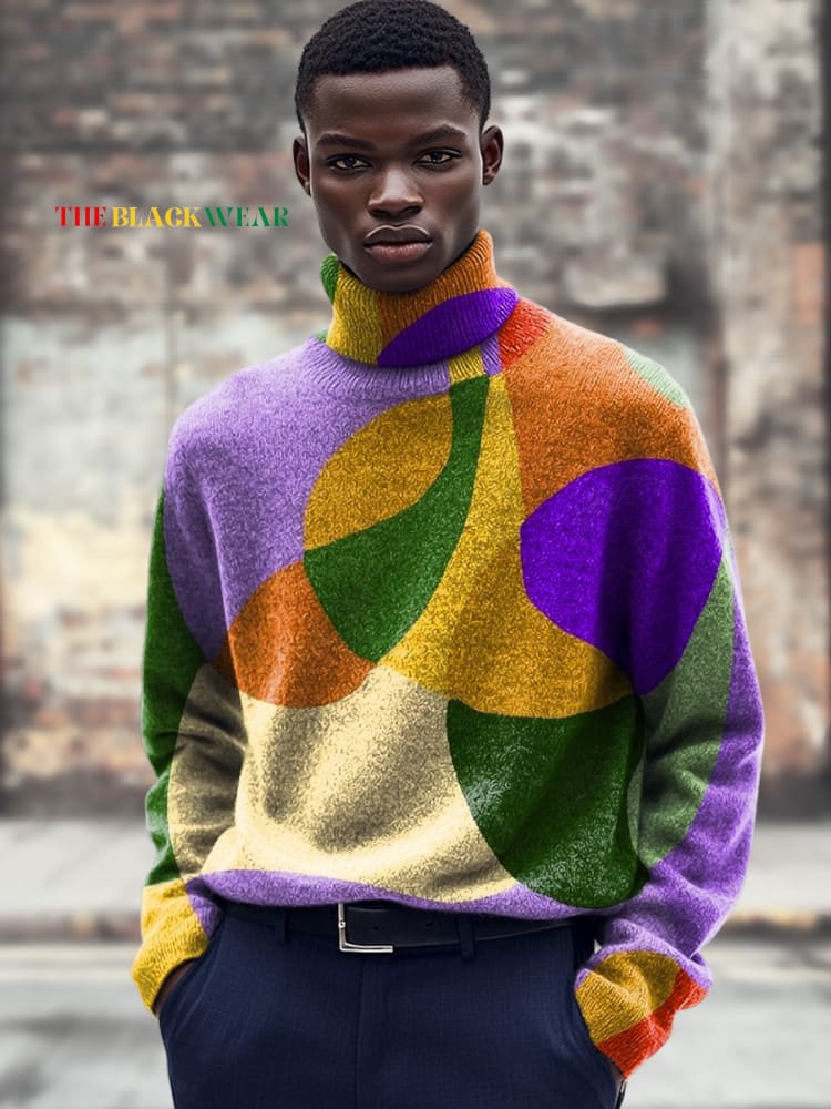 Abstract Colorful Geometric Art Print Knit Turtleneck Pullover Sweater
