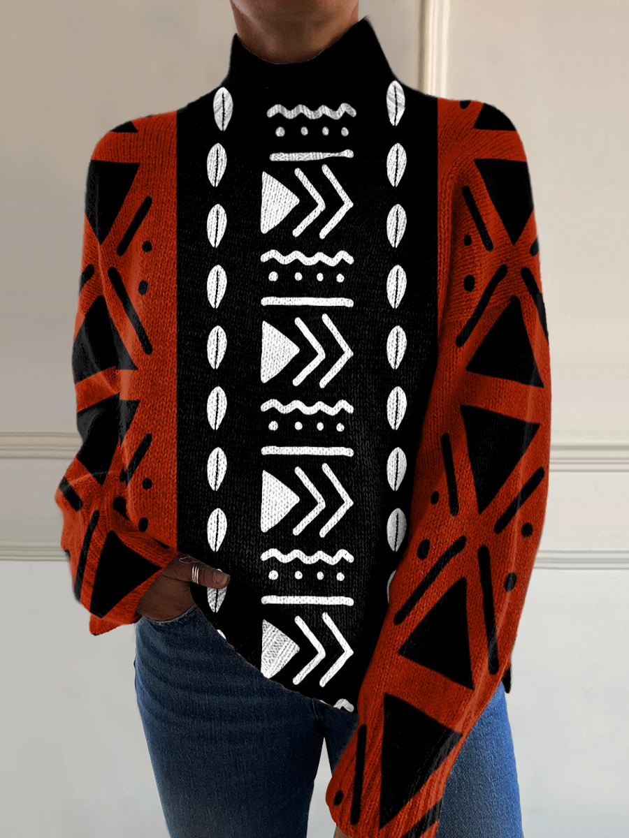 Colorful Retro Geometric Stripes Art Print Knit Turtleneck Pullover Sweater