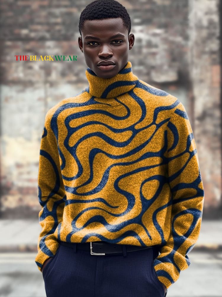 Men's Vintage Art Abstract Lines Print Knit Turtleneck Pullover Sweater