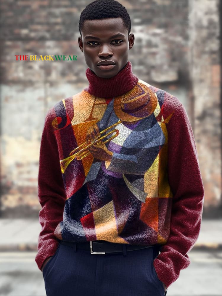 Vintage Jazz Trumpeter Decorative Pattern Knit Turtleneck Pullover Sweater