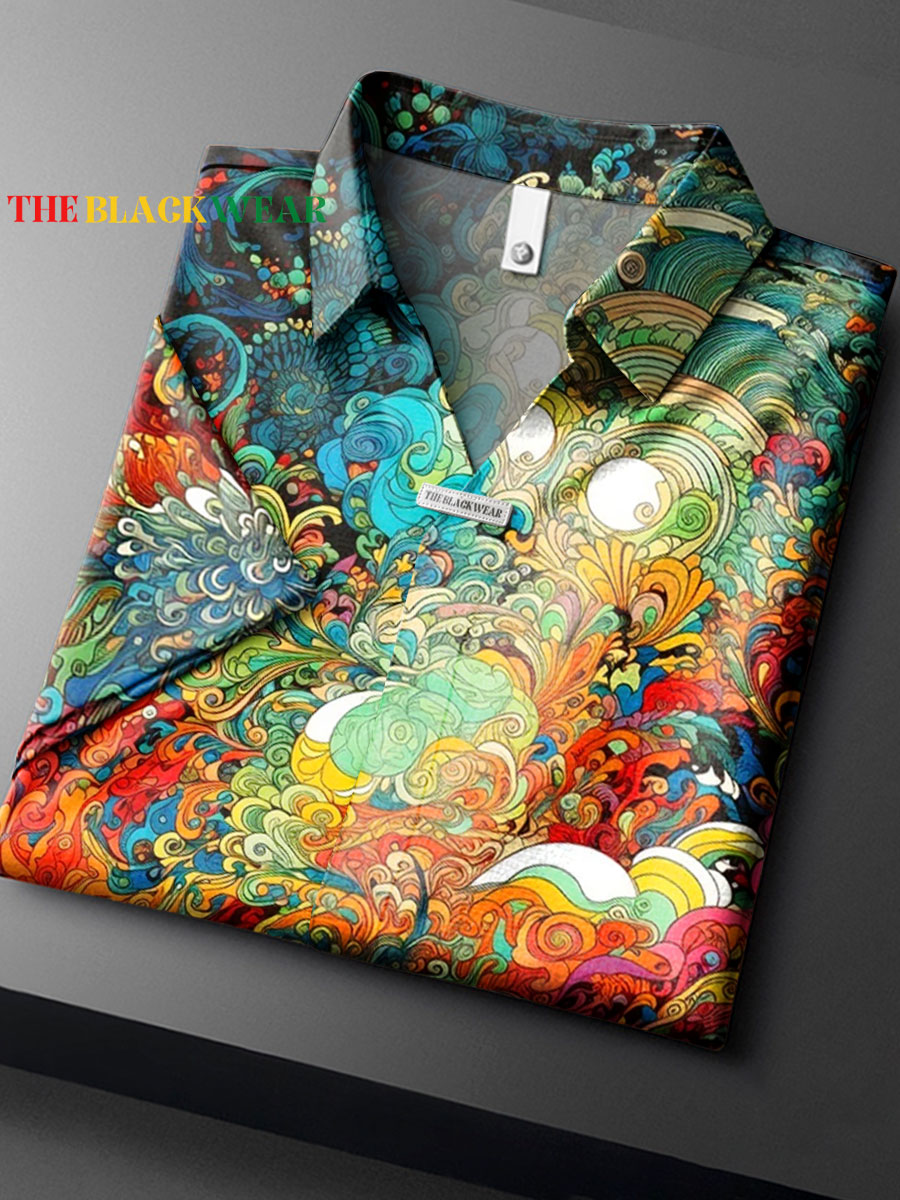 Vintage Abstract Geometric Color Block Art Print Casual Short Sleeve Lapel V-neck Polo Shirt