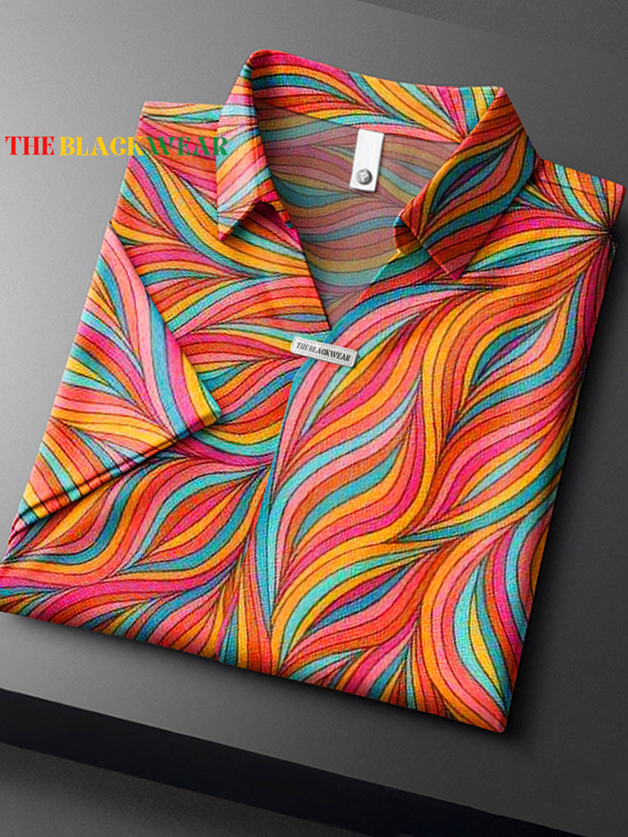 Vintage Abstract Geometric Color Block Art Print Casual Short Sleeve Lapel V-neck Polo Shirt