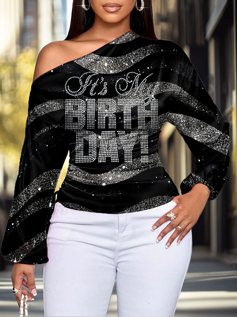 Women's Fashion Shiny Rhinestones It's My Birthday Art Print Asymmetrical Slant Collar Shirt