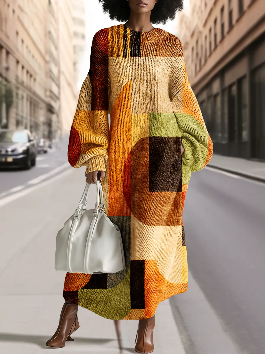 Women's Retro Abstract Geometric Art Print Silhouette Round Neck Heathered Knitted Maxi Dress