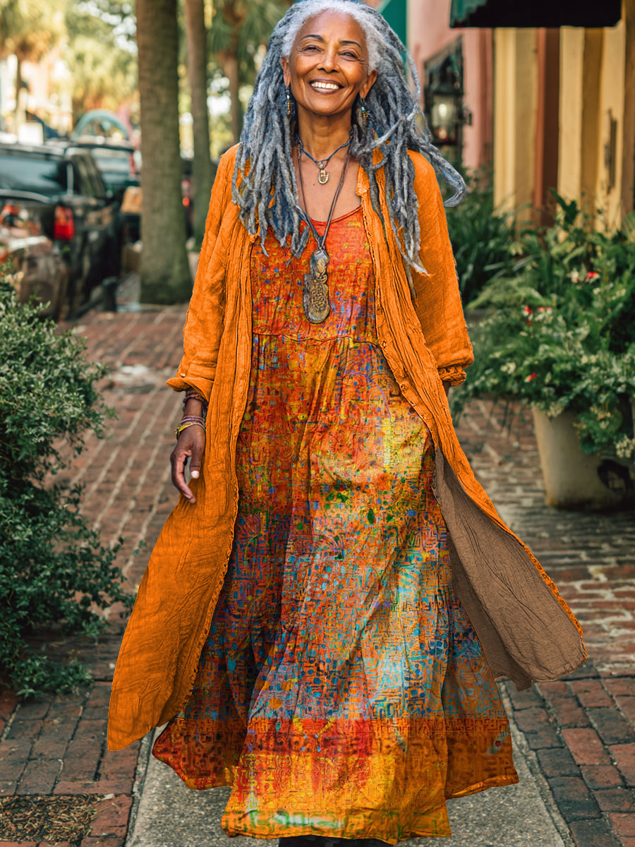 Women's Vintage Abstract Ethnic Pattern Art Print Casual Cotton Cardigan Cardigan Suspender Dress Two-Piece Set