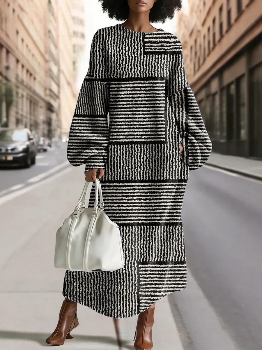 Women's Fashionable Stripes Art Print Silhouette Round Neck Maxi Dress