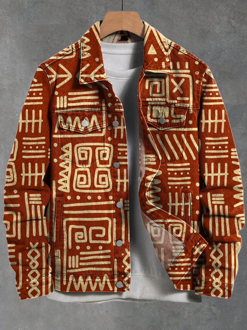 Men's Vintage African Tribe Pattern Art Print Casual Denim Jacket