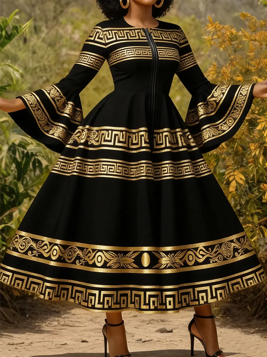 Retro Meander Pattern Print Ruffle Sleeve Maxi Dress
