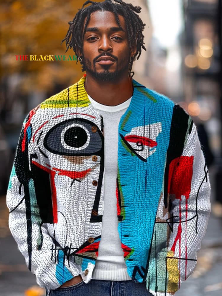 Vintage African Art Abstract Geometric Face Painting Print Buttoned Cardigan Sweater