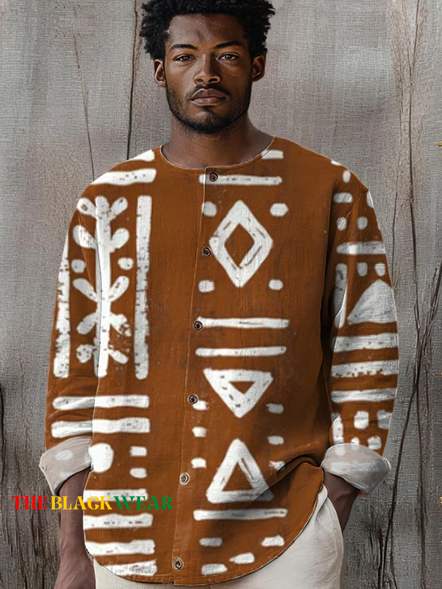 Vintage African Art Geometric Patterns Vintage Print Casual 100% Cotton Shirt