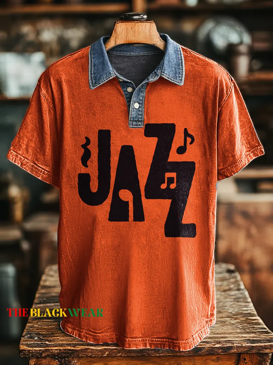 Vintage Jazz Music Print Casual Denim Polo Collar Short-sleeved T-shirt