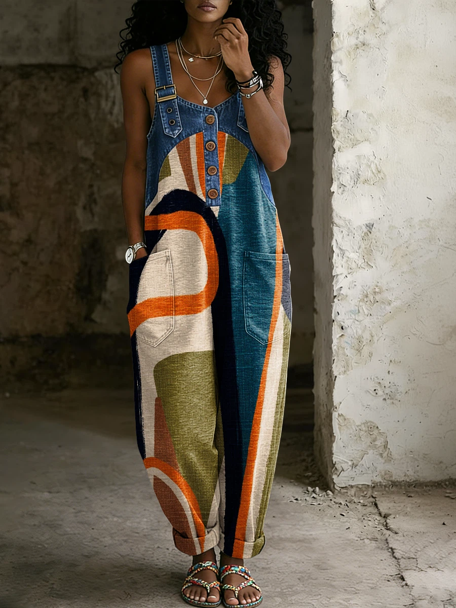 Women’s Fashionable Abstract Stripes Print Casual Denim Denim Patchwork Jumpsuit