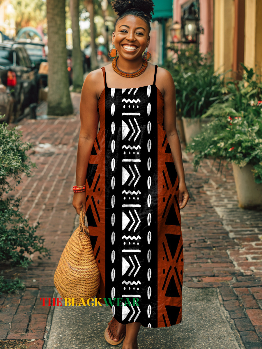 Women's Colorful Africa Tribal Geometric Stripes Art Print Sleeveless Suspender Casual Cotton Pocket Dress