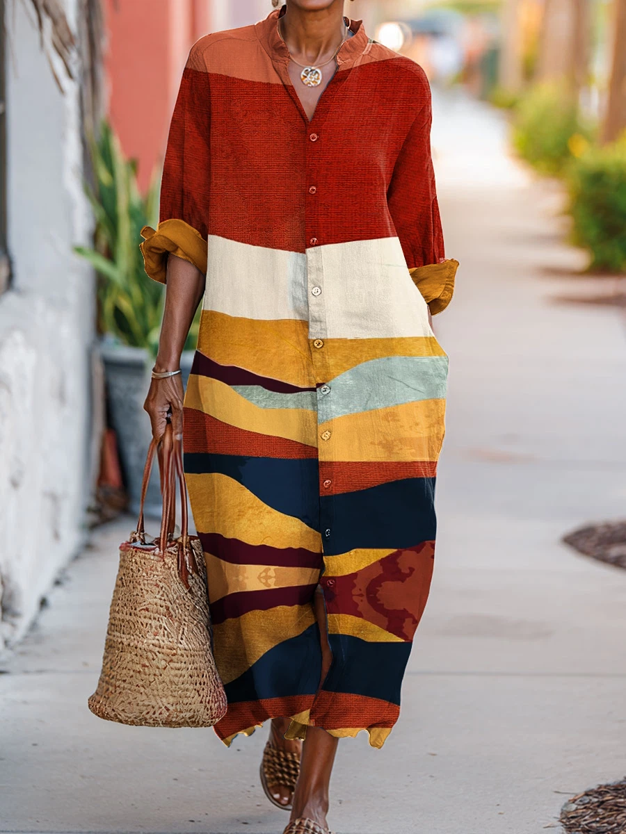 Women's Colorful Stripes Art Print Cotton Lapel Button-Down Shirt Dress