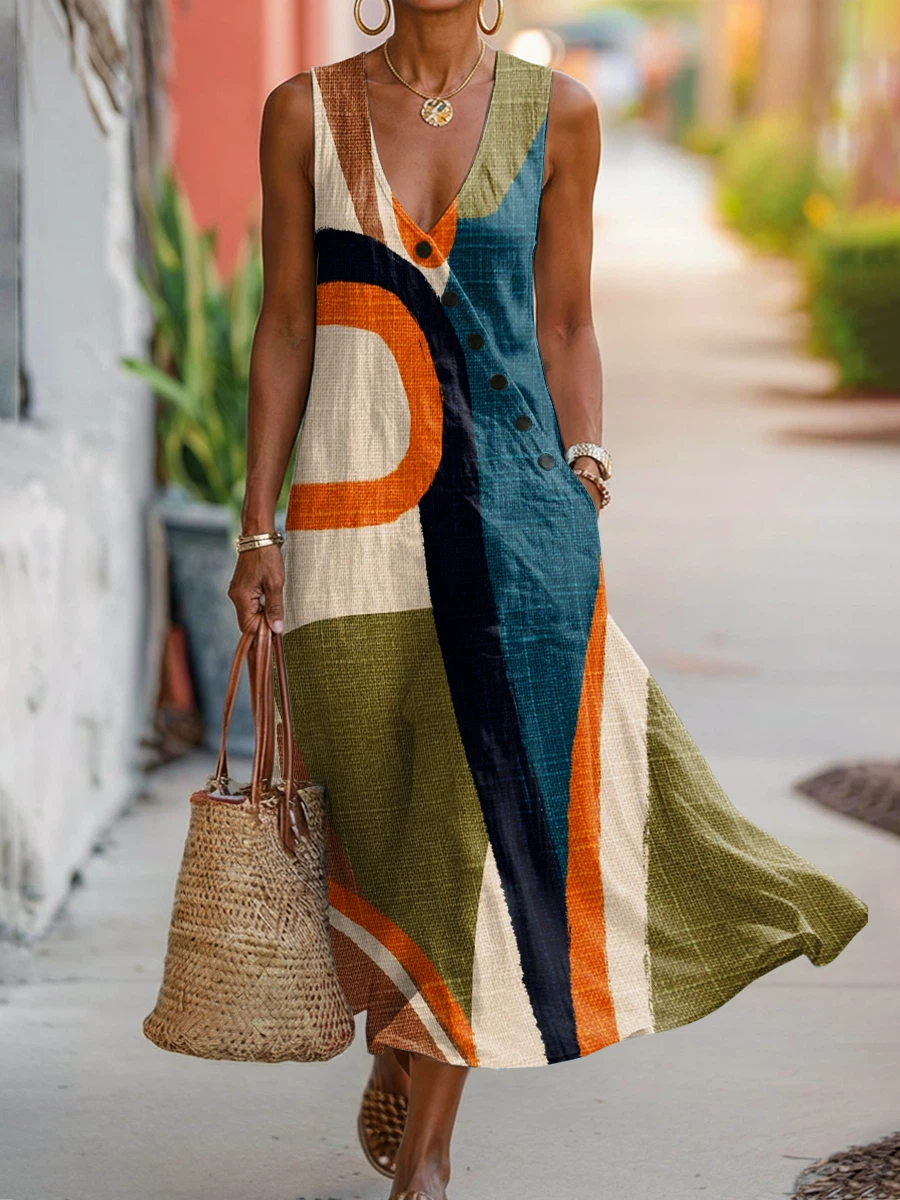 Women's Fashion Abstract Stripes Print Button Sleeveless V-neck Dress