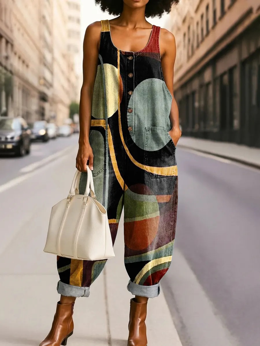 Women's Retro Abstract Geometric Art Print High Rise Asymmetrical Button Layered Wide Leg Jeans