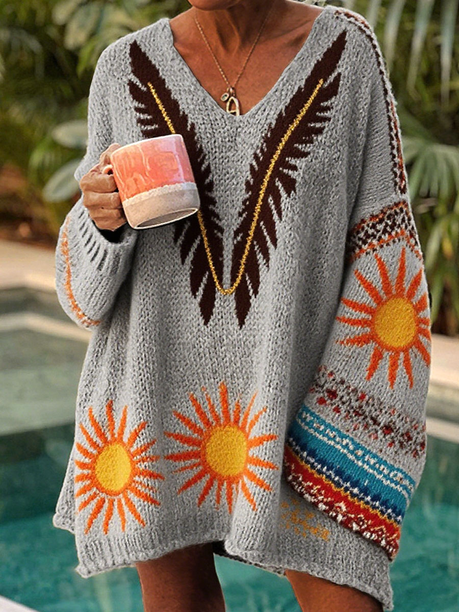 Women's Vintage Bohemian Floral Art Print Casual Pullover Sweater