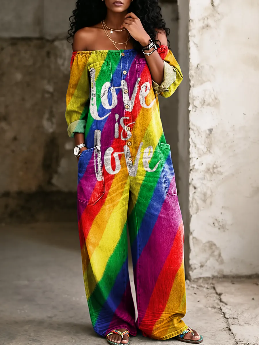 Women's Vintage LGBT Rainbow Pride Month Art Print Loose-fitting Off-shoulder Pocket Jumpsuit