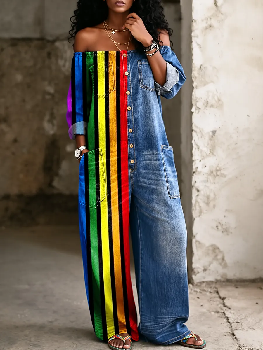 Women's Vintage LGBT Rainbow Pride Month Art Print Loose-fitting Off-shoulder Pocket Jumpsuit