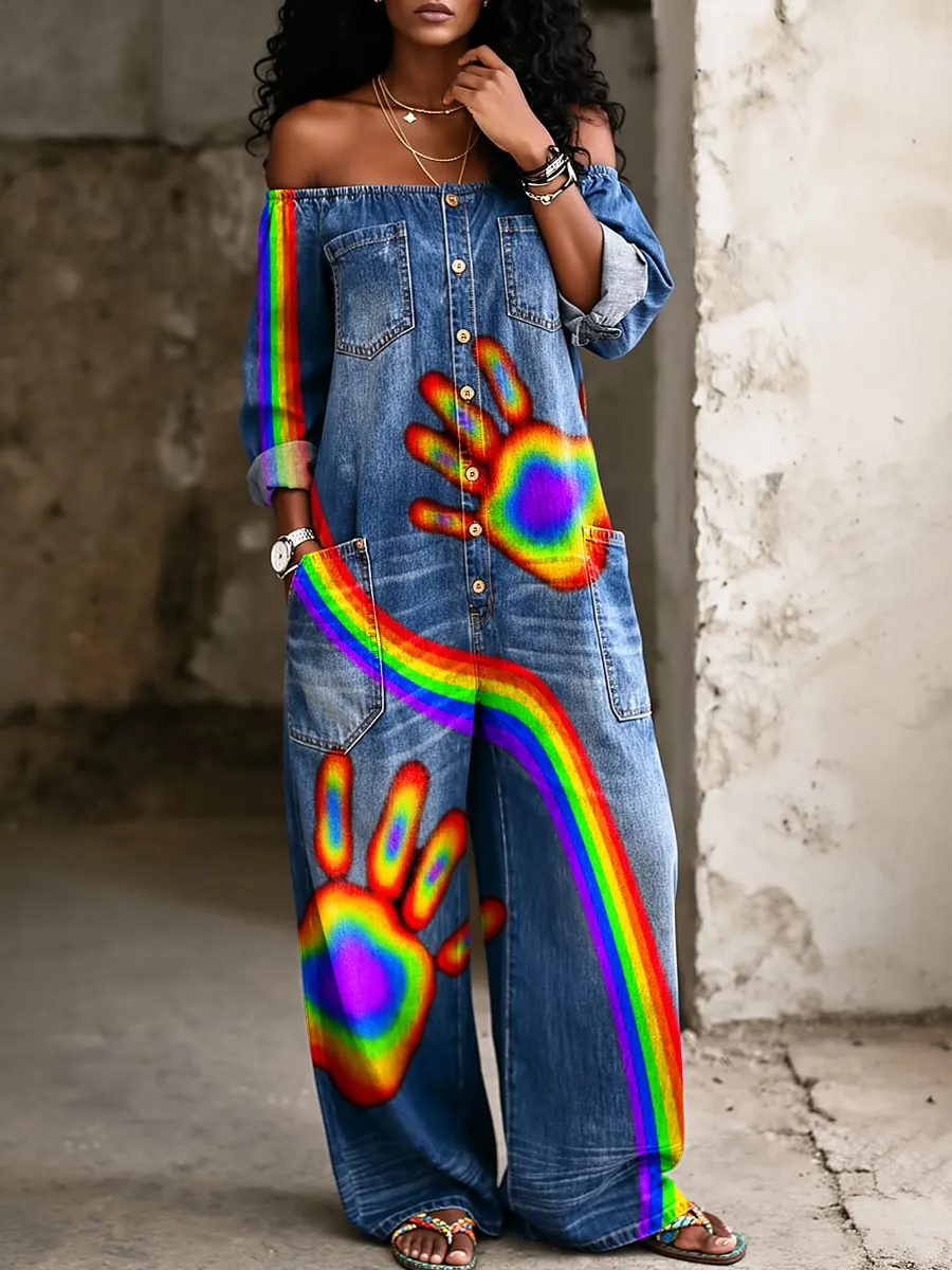 Women's Vintage LGBT Rainbow Pride Month Art Print Loose-fitting Off-shoulder Pocket Jumpsuit